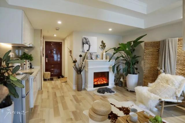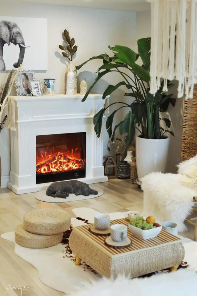 壁炉和那只狗虽然只是装饰,但营造了非常慵懒的气氛。两棵大型的绿植,是真的,让整个房间生机勃勃。