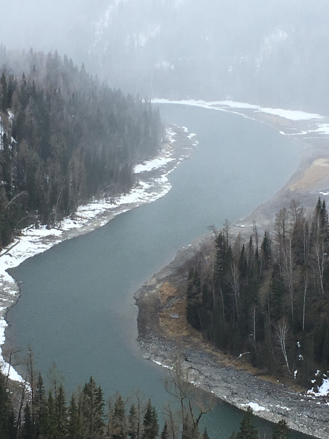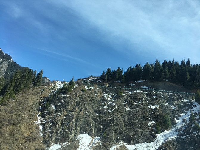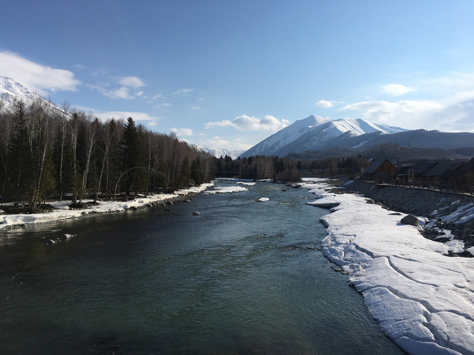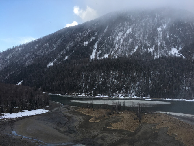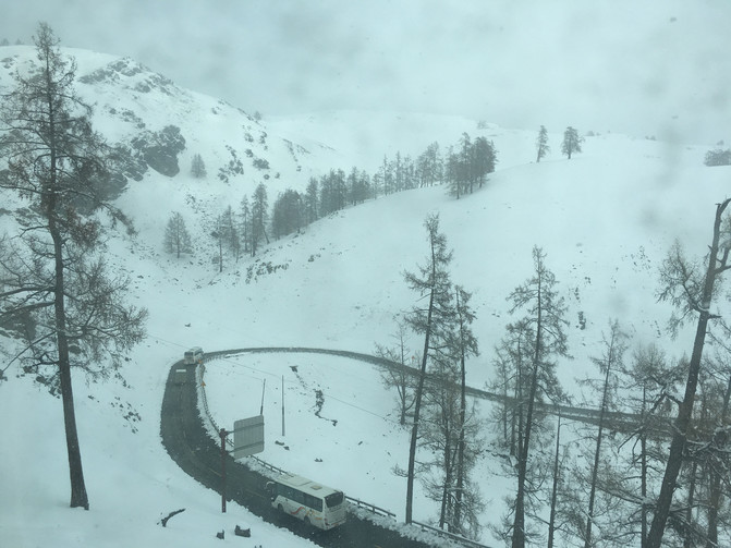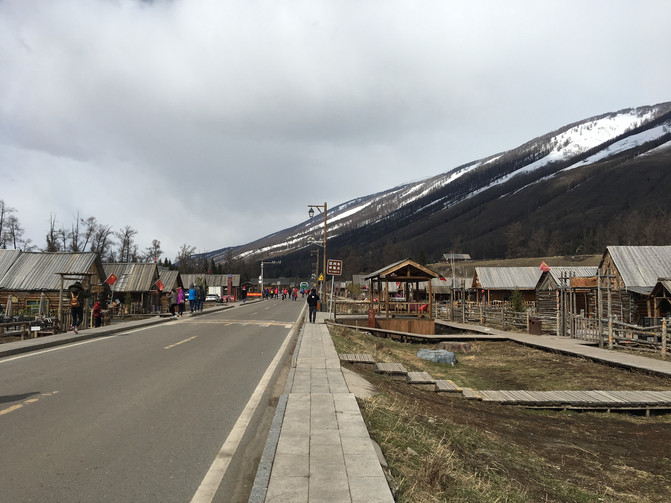 10:30从五彩滩出发前往喀纳斯风景区,导航显示全程140公里。经过4个小时的车程才于下午14:30才到达贾登峪吃午餐,当然期间还经过严格的安检,由于途中遇到大雪,在安检处,旅游大巴都依次排队,由警车压道,车队始终保持30码左右的车速前进。