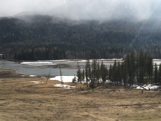 旅游大巴才被允许开到湖边入口处,然后再接驳我们到二十几公里外的喀纳斯湖边观景台,真正到达喀纳斯湖核心的水怪出没的地方差不多用时一个小时。观鱼台因为没开放,只能在对岸的湖边远望着,