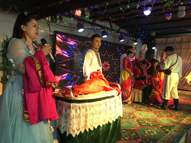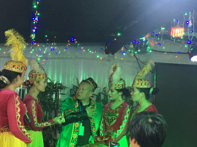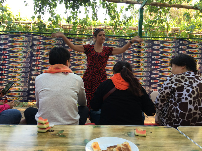 下午7点半,走进维吾尔族农家,在葡萄架下品尝水果点心、观看少数民族的歌舞表演。