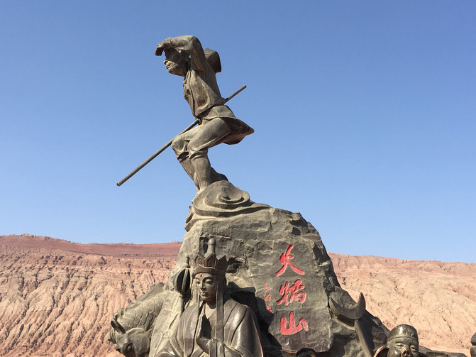 。地面景观区北面,主要有有孙悟空、铁扇公主及牛魔王的大型铜雕。有句大话西游的名言得记下:只有借不到的芭蕉扇,没有翻不过的火焰山。