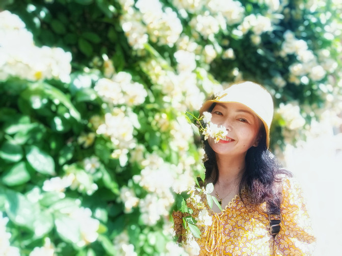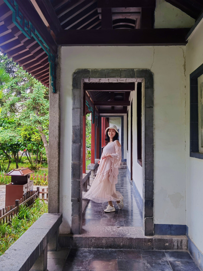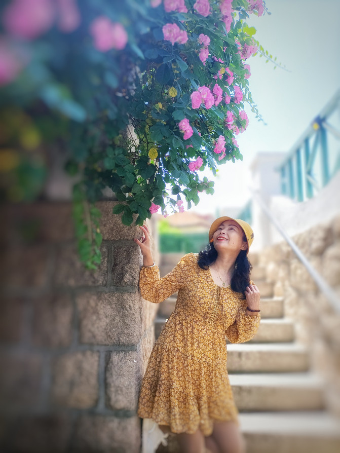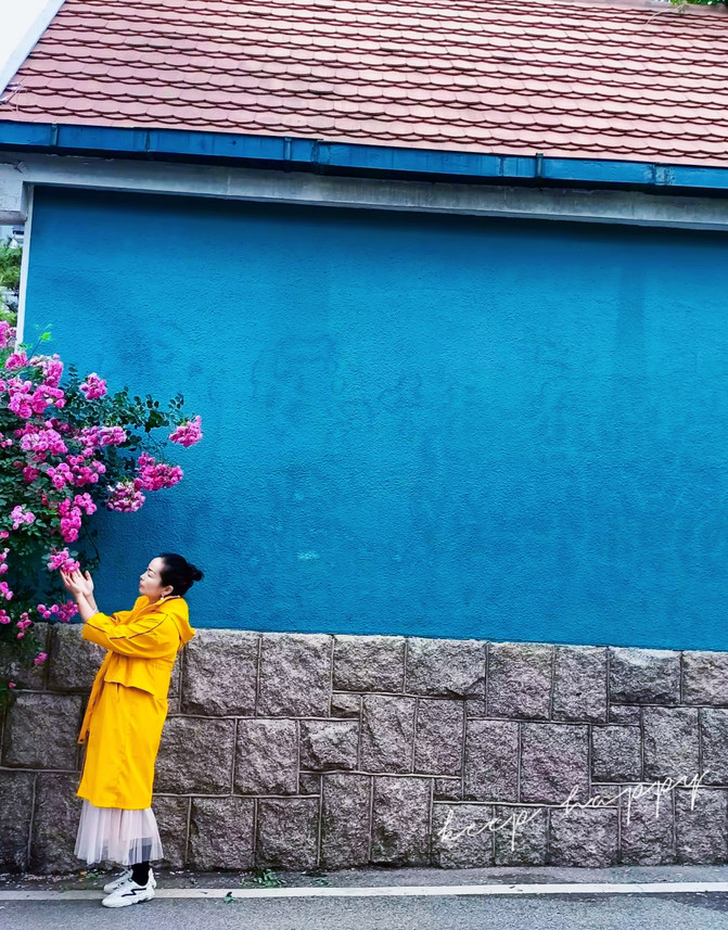 院落内的粉色蔷薇一直延伸至墙外且随风起舞,场景浪漫且唯美,必须拍照。