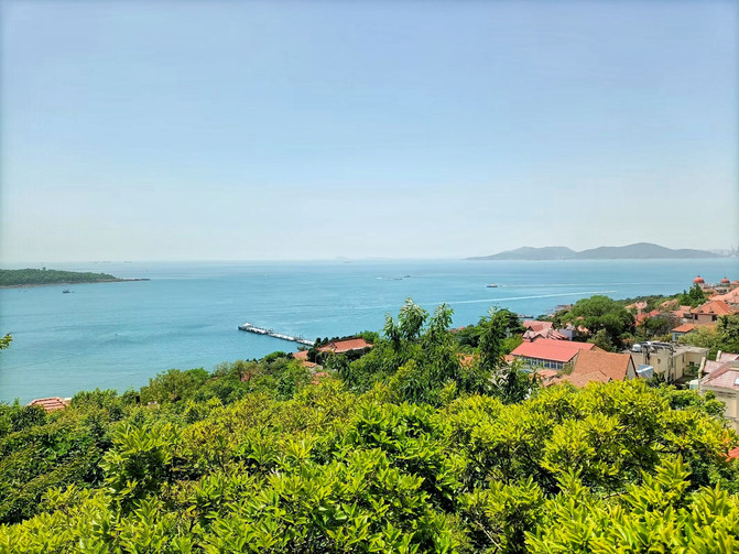 一路上,粉色的蔷薇依然垂落在每家每戶的院墙外,我觉得青岛的每个角落都充满着蔷薇的香味,在小鱼山上可以观赏到青岛最红典的绿树红瓦,碧海蓝天的景观。