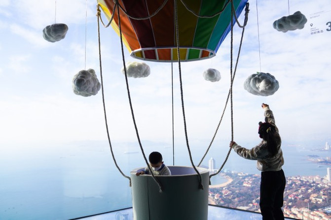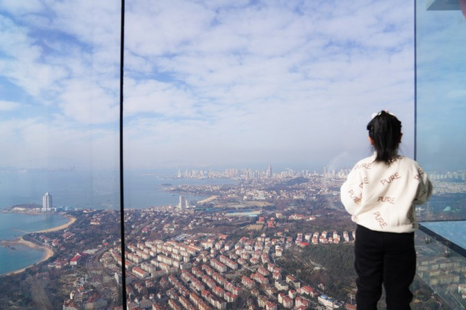 冬游青岛的第一站来到了云上海天观光厅,云上海天是山东省超高层垂直建筑之上的高空观光平台。在这里可以360°俯瞰壮美海景、山景、城景,全方位感受身处天空之城的独特体验。