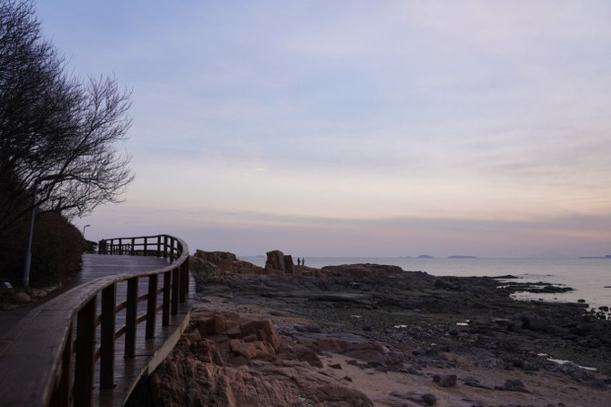 遗憾的是,我们到这里游览时是冬季,没能赶得上那些绝美的“一关一树”,但很快,我的遗憾便被这令人震撼的日落景象所弥补。随着眼前的落日慢慢沉入大海,思绪也慢慢散开,青岛的海,有时激情似火,有时平静如镜,有时波澜壮阔,有时温情婉约,你怀着怎样的心情去看海,他就会以怎样的姿态来陪伴你。