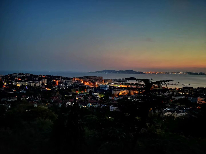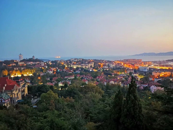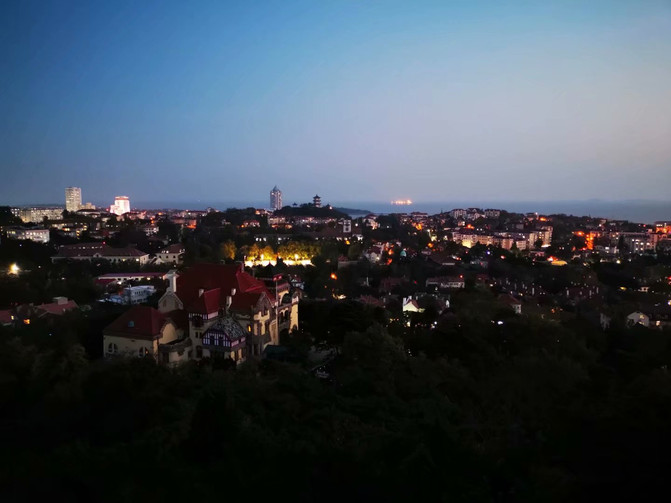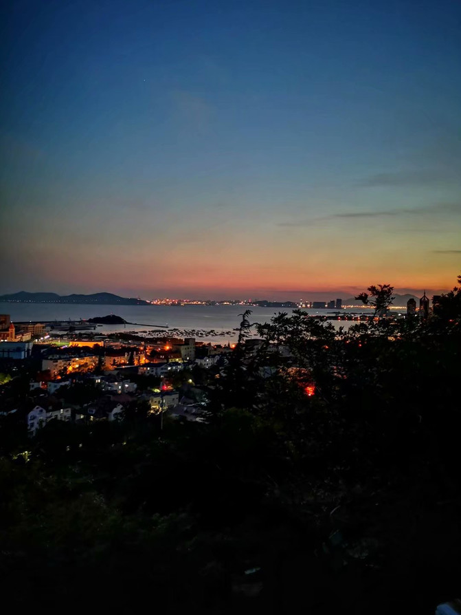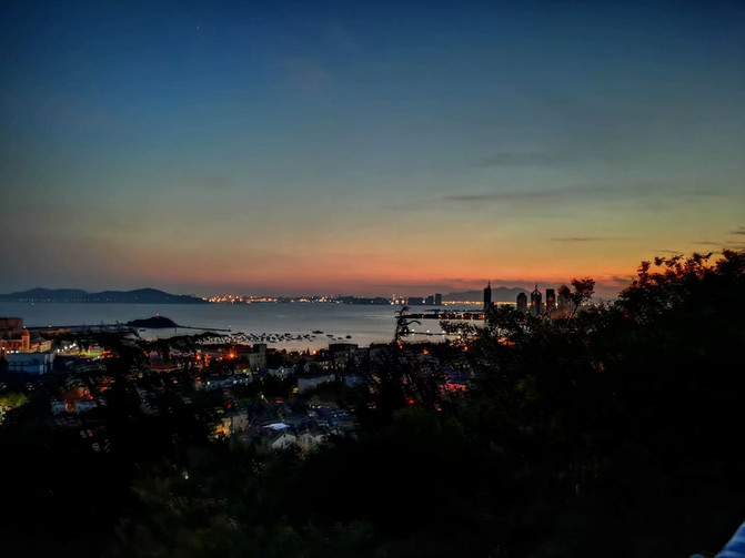 5点半出了德国总督旧址,赶往下一个景点——信号山公园,气喘吁吁爬上山坡,原本想从高处俯瞰青岛的红瓦绿树碧海蓝天,结果望下去只有点点灯火,红瓦绿树是黑的,碧海蓝天也是灰蒙蒙的,但是一抹晚霞自有她的不同寻常之处。