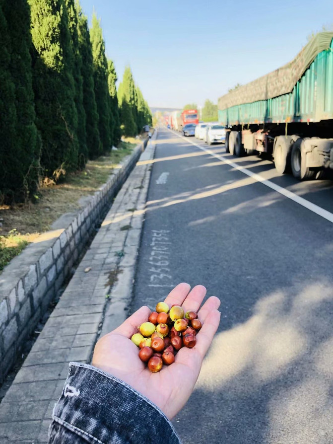 堵车时,有人用伞遮着“唱歌”,有人在野地里摘野酸枣,有人以车的长龙为背景拍照。