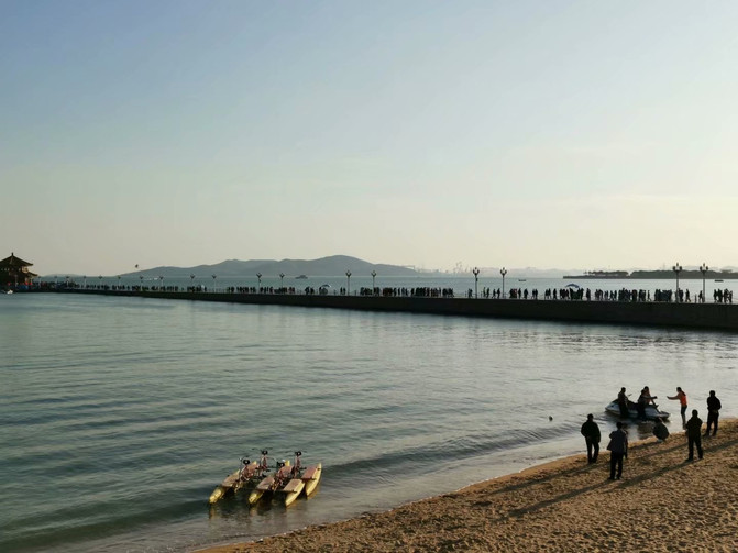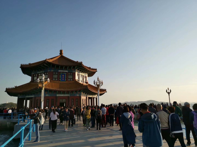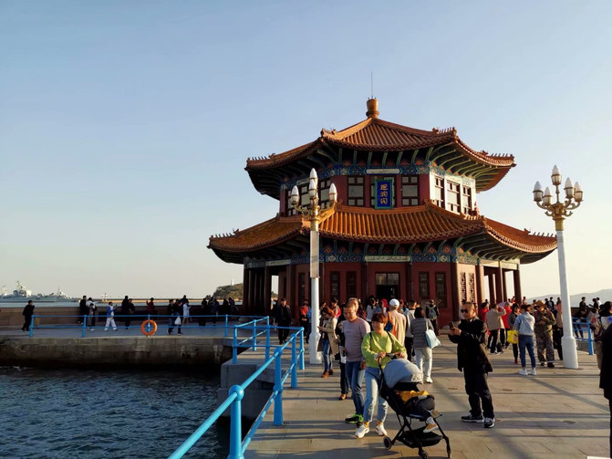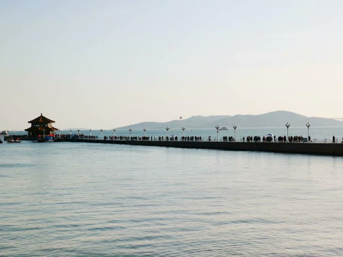 下船后,到了栈桥,是必游景点。它是1892年青岛军事专用人工码头建筑。