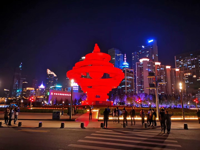 再到五四广场看青岛夜景,据说是2018年6月,上海合作组织成员国元首理事会在青岛成功举办,对青岛产生重大影响,峰会过后青岛五四广场灯光秀成为青岛一道亮丽风景线,当年青岛市政府花了500亿打造。今晚没有灯光秀,7点亮灯了,五四广场的火炬红艳艳的,像一团火球在燃烧,远处海面的帆船,近处的高楼大厦灯光闪烁,恰似银河落九天。