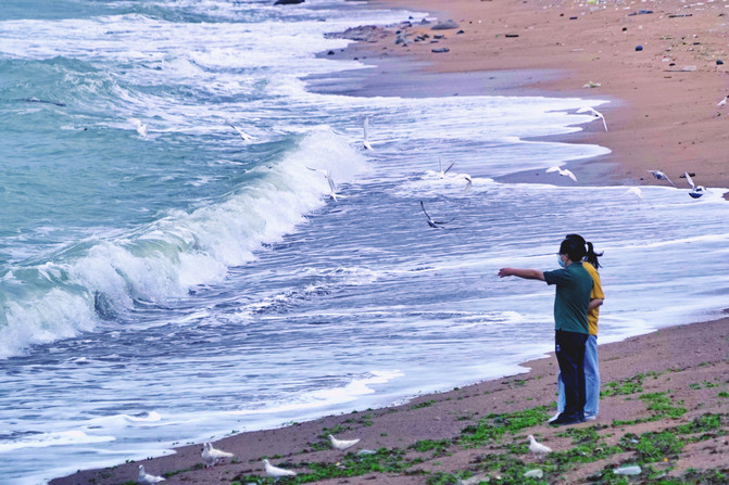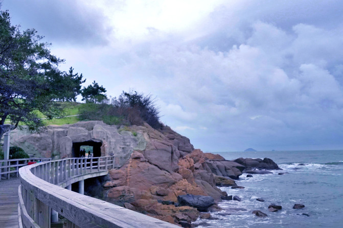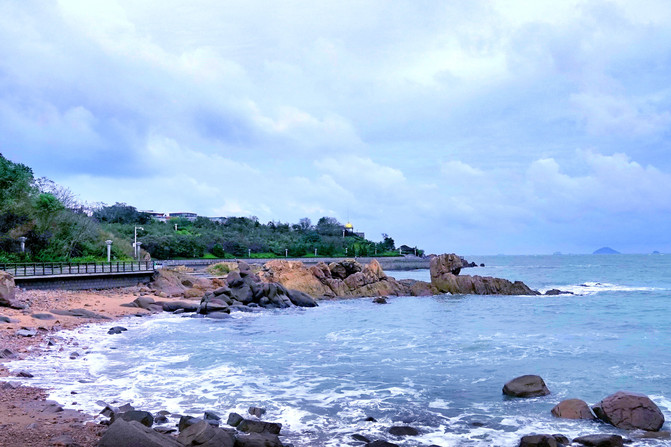 阴雨天气,海风吹在脸上丝丝清凉。漫步走在木栈道上,行人很少。这里的海水更见清澈,海上浪花声声拍打着礁石,像一首欢快的歌。一群鸟儿在海滩上飞起飞落,融入在大自然中,心情也会变得平静安详。