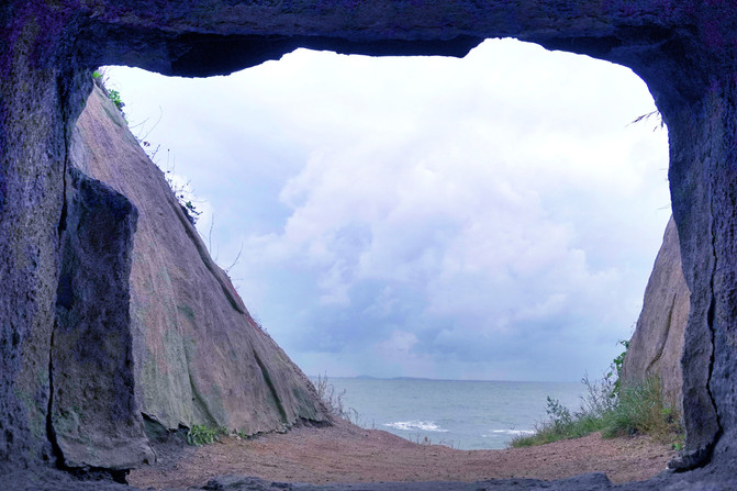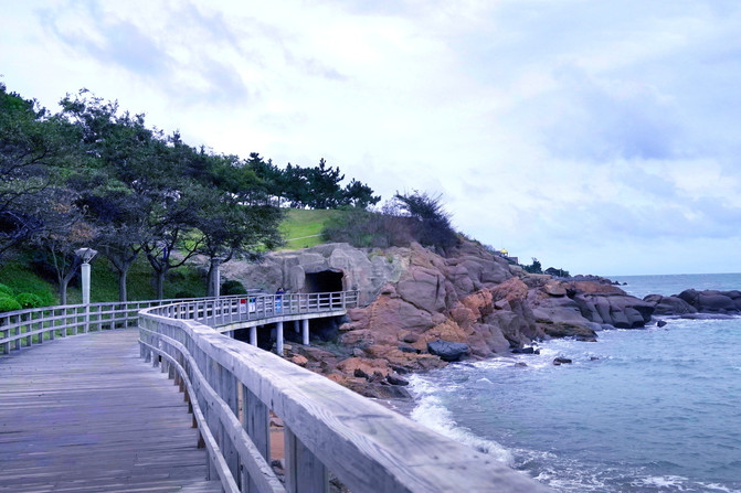 木栈道向前延申,不远处便是宝藏打卡点——秘境山洞。据说这个新晋网红打卡地在旅游旺季也得排队拍照。如果时间允许,可以沿着木栈道慢慢游玩,一直沿着海岸线走能走到奥帆中心。