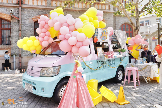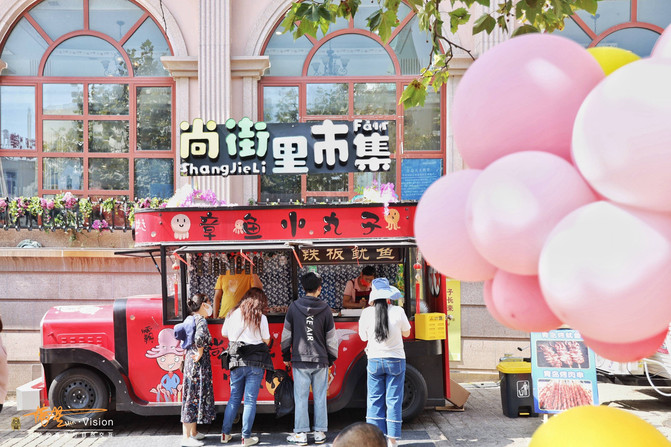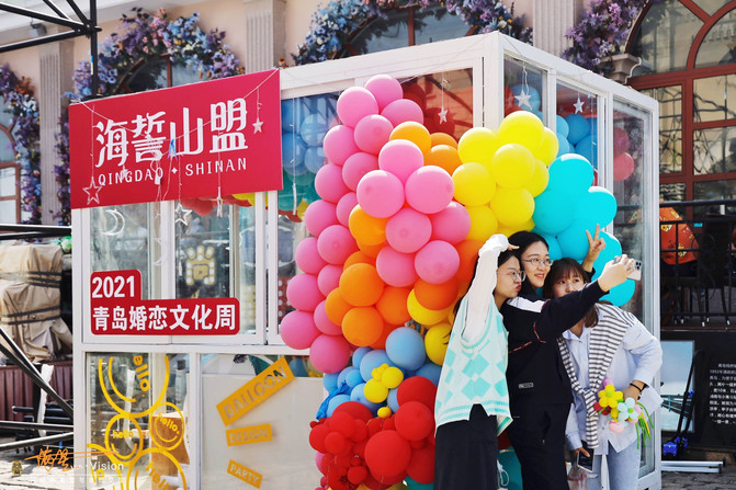正值2021青岛婚恋文化周,这个小广场上,一些高端酒店、婚礼婚庆公司、已经布置了许多婚礼的元素,五彩的气球随处可见,小商家的餐车也是布置的特别喜庆。