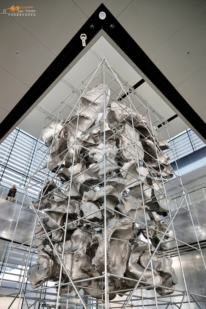 穿过展厅间的连廊进入西海美术馆5号展厅,迎面40件半悬于空中的银灰色物块闯入视野,像层层卷积的云团聚落,又仿佛是从未知空间穿梭而来的异型飞行器,蓄势以待一场星际间的巡回漫游。