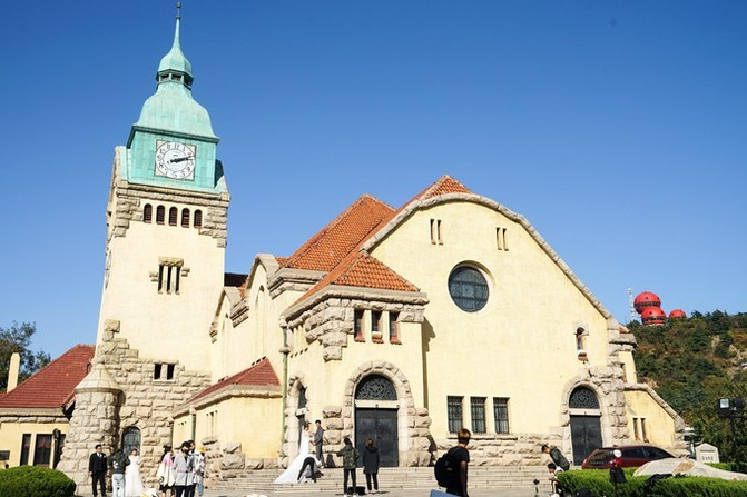 前往信号山的路上我们还经过了 青岛 基督教堂,这座修建于1908年教堂位于 江苏 路15号,规模远远不如天主教堂宏伟。到教堂还需要走上一个小山丘,教堂进院需要收费10元,这里同样是有大量拍婚纱照的情侣。
