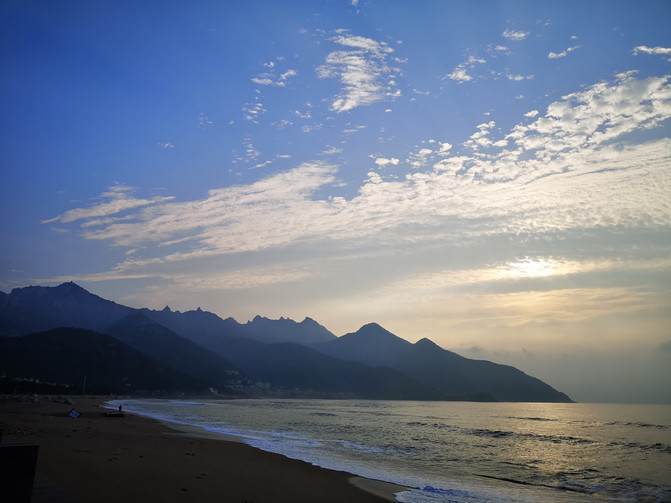 从太清景区回来,晚上吃过晚饭,看到海面上升起一轮明月,于是来到沙滩上。皎洁的月色倾洒在海面上,浮光潋滟,伴随着阵阵海浪拍打沙滩的哗哗声,使人浮躁的心境顿时平和许多。此时沙滩上已经没有了白天喧嚣的人群,我们可以尽情享受这宁静美好的月夜。