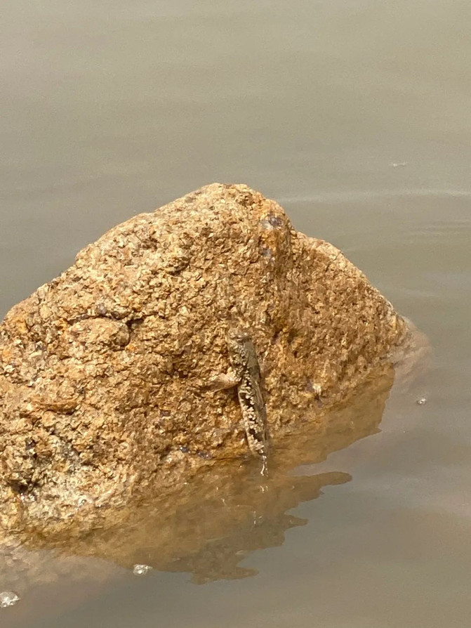 好奇的弹涂鱼,趴在石头上,人一走近就一跳一跳弹走了