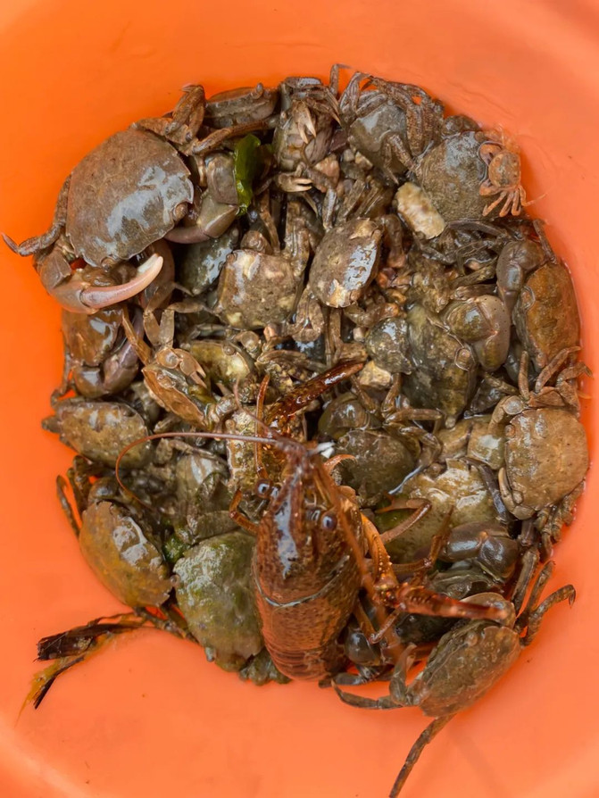 今天是个收获的日子,各种大大小小的螃蟹、龙虾装满了小桶,不少还是中等个头