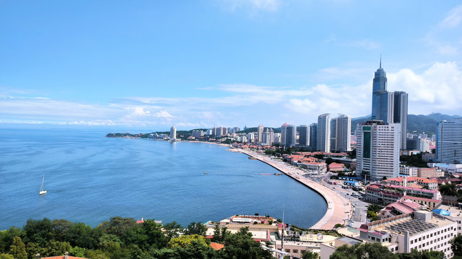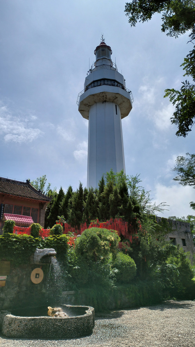 登山灯塔远眺繁忙的烟台港,远处马鞍形建筑就是烟台火车站。