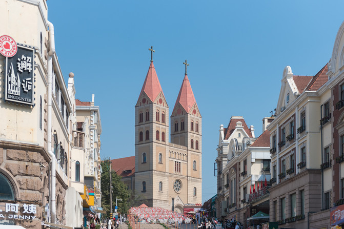 从春和楼出来,沿着中山路向南步行几分钟,就能看到天主教堂,这也是青岛最知名的网红打卡地之一,同时也是青岛婚纱摄影胜地,许多新人都在这里拍婚纱。