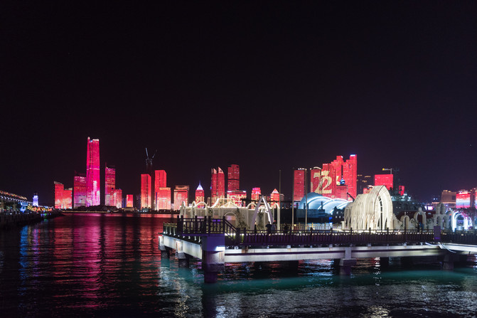 晚上来到奥帆中心情人坝,品尝当地人推荐的海鲜饺子。情人坝晚上很热闹,这里可以欣赏浮山湾夜景灯光秀,地理位置绝佳。