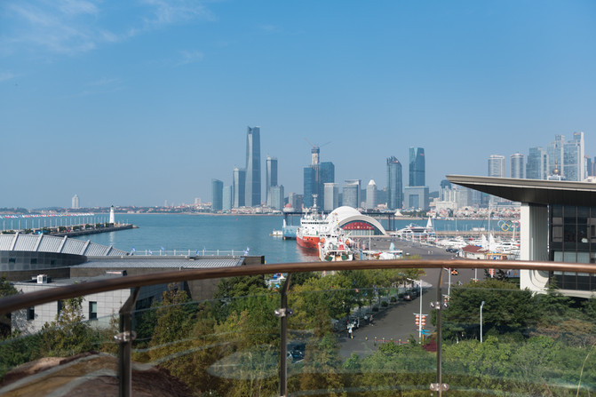 一边是高楼大厦的都市风光,一边是浩瀚的大海,另一边则是红瓦绿树碧海蓝天的青岛老城区,这样的风景太美了。