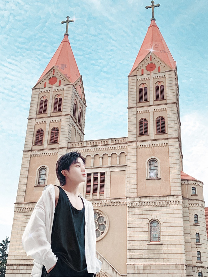 粉红色的教堂在 青岛 独有的红砖屋顶映衬下更美了