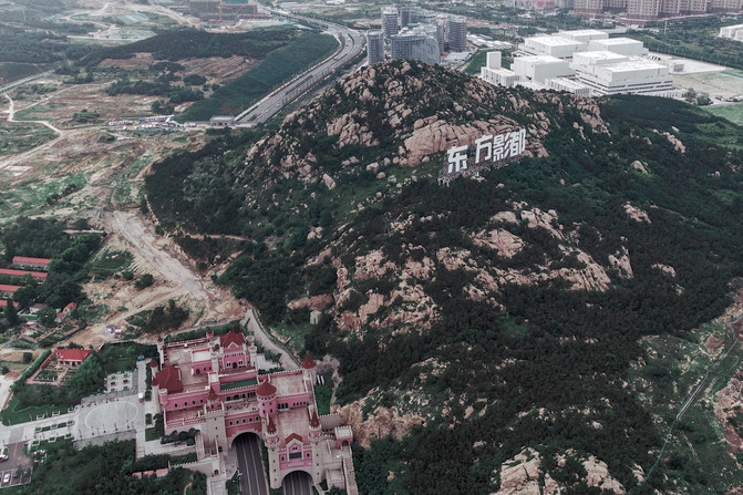 从上空可以看到东方影都伫立在山上