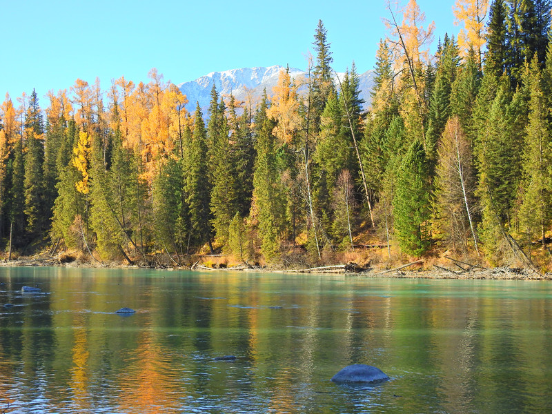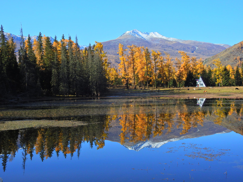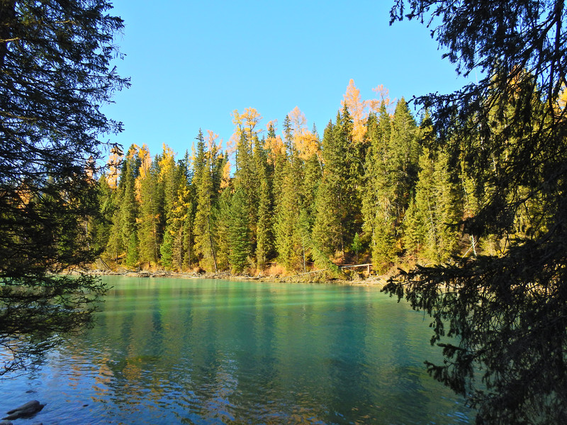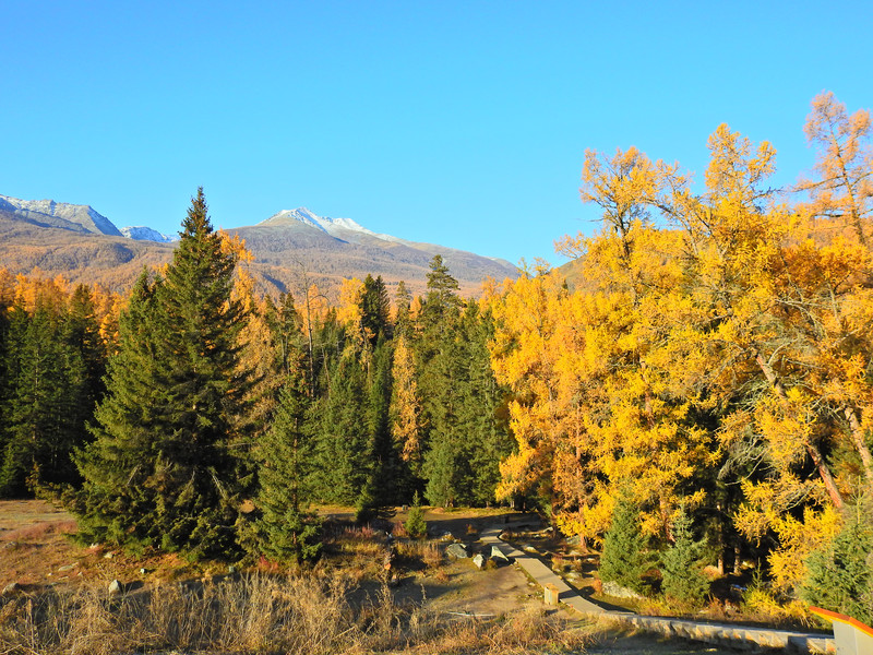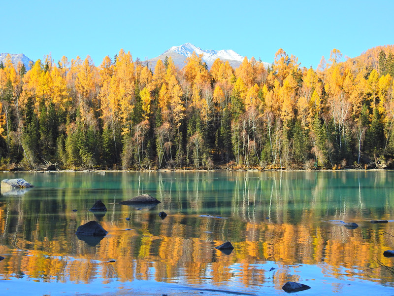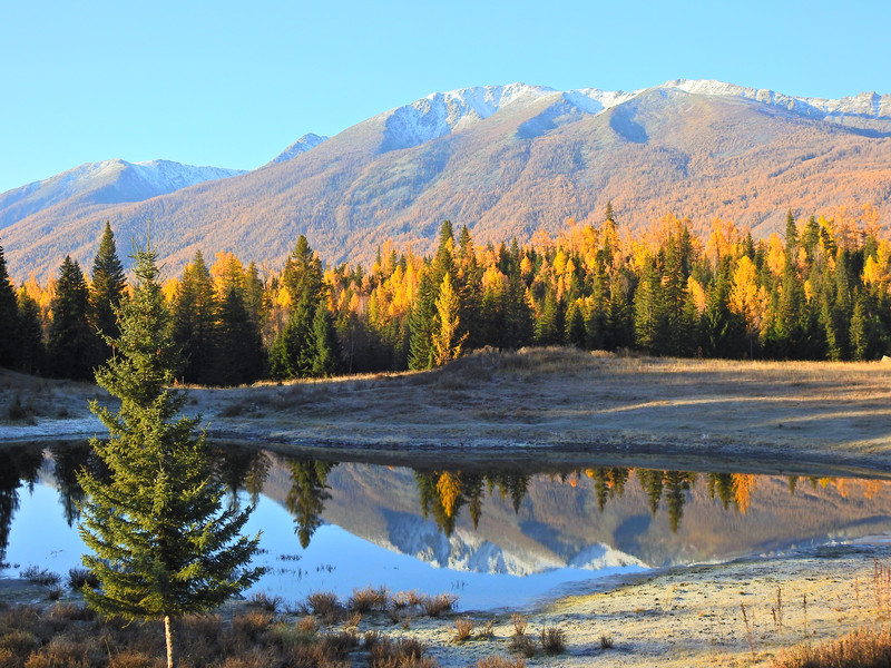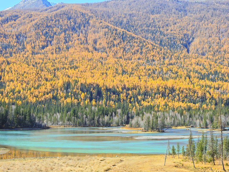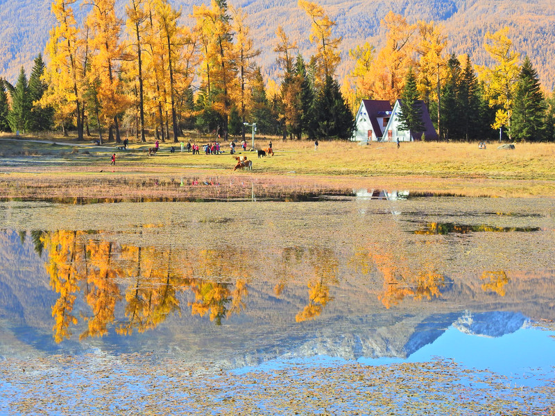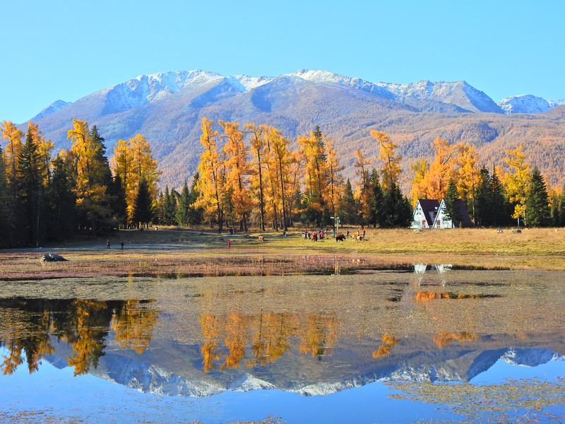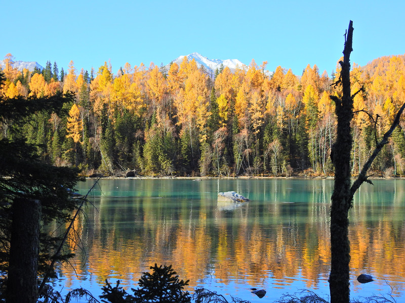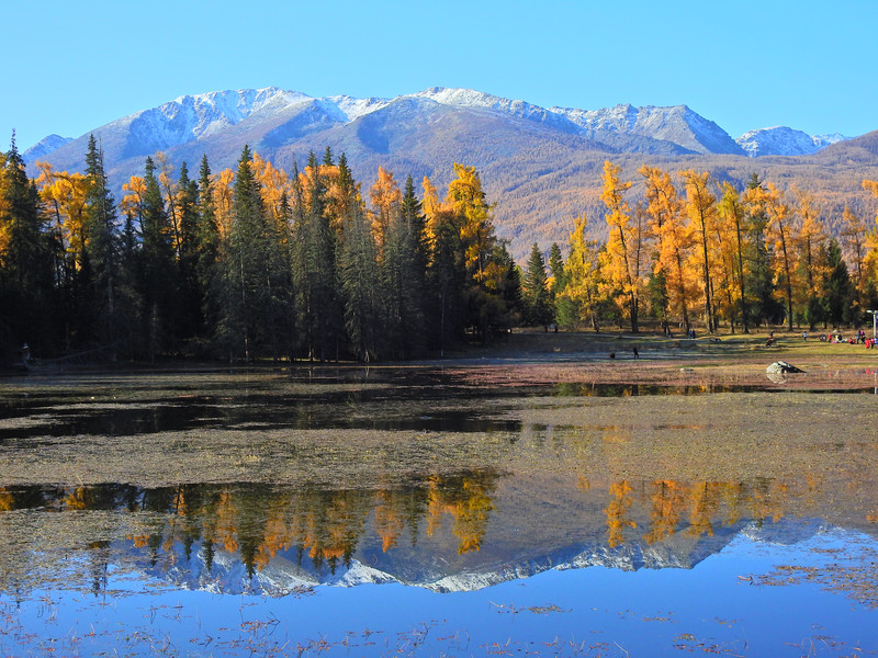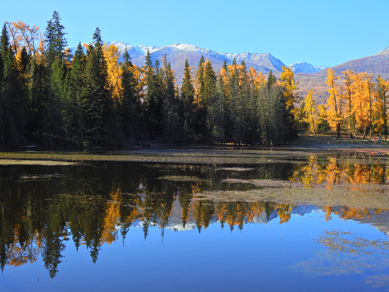 在喀纳斯湖入口处不远一处就有一处美景,远处的山峰、白雪、蓝天以及近处的黄色落叶松都映衬在一池湖水之中