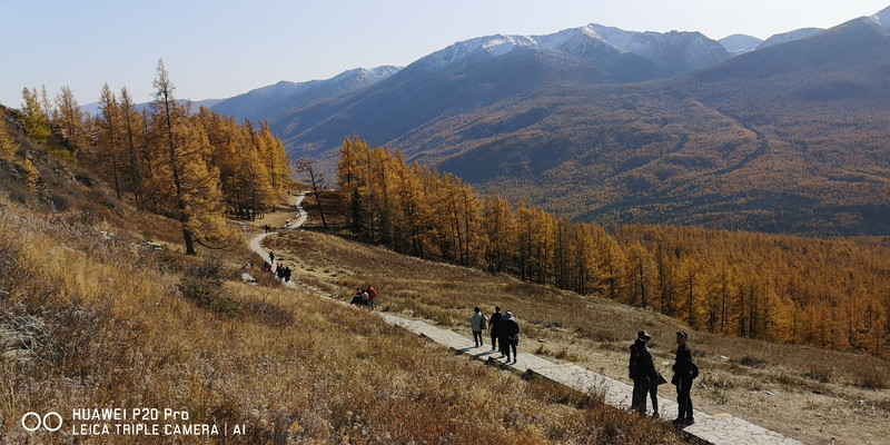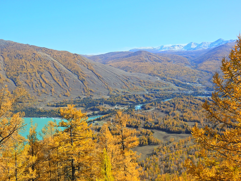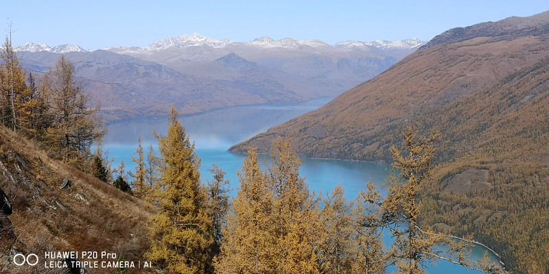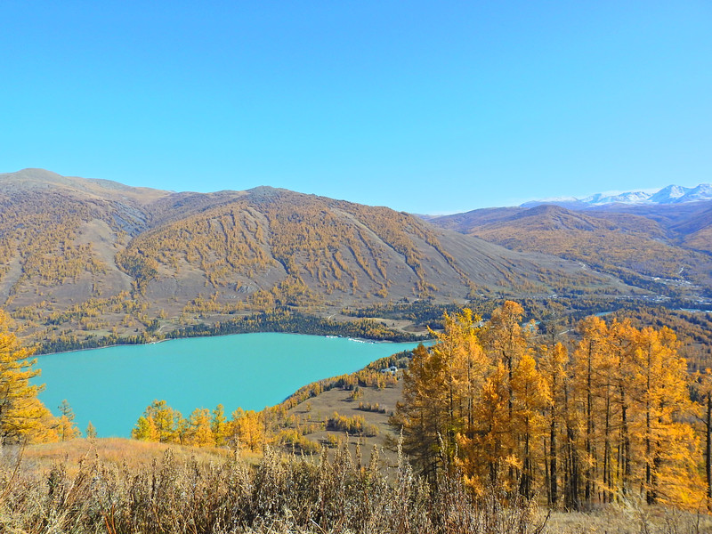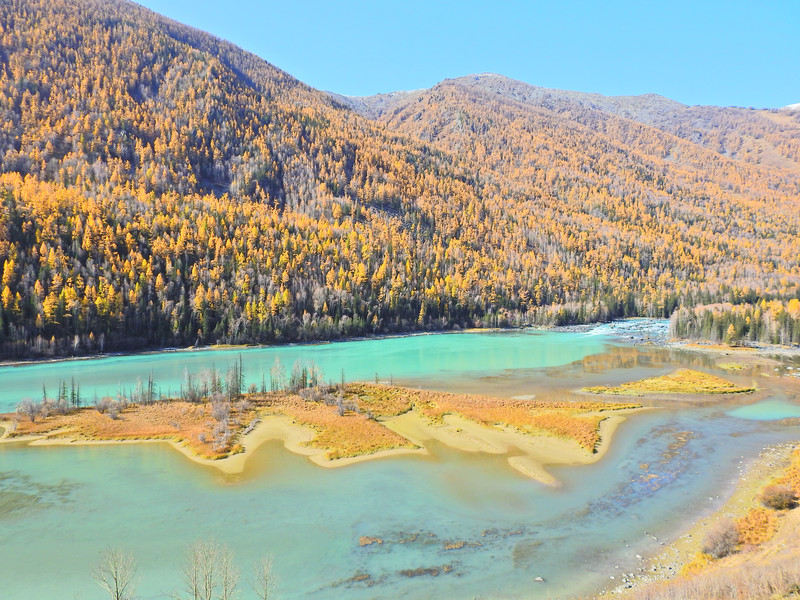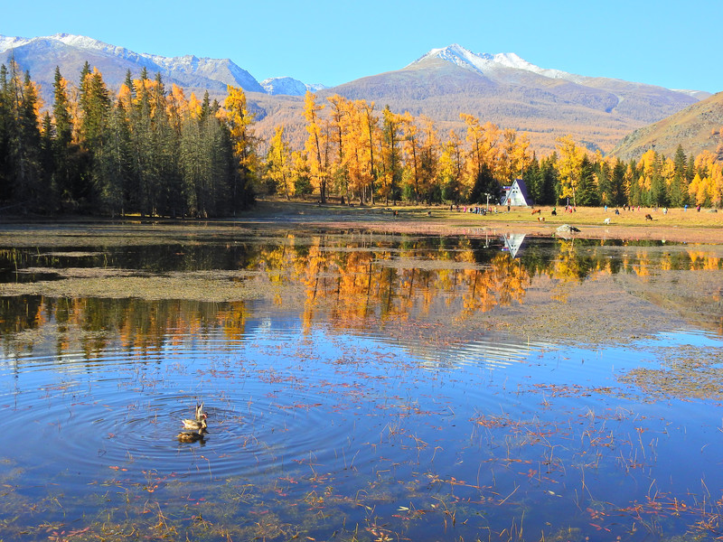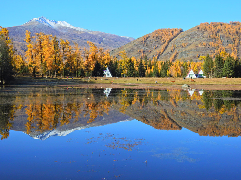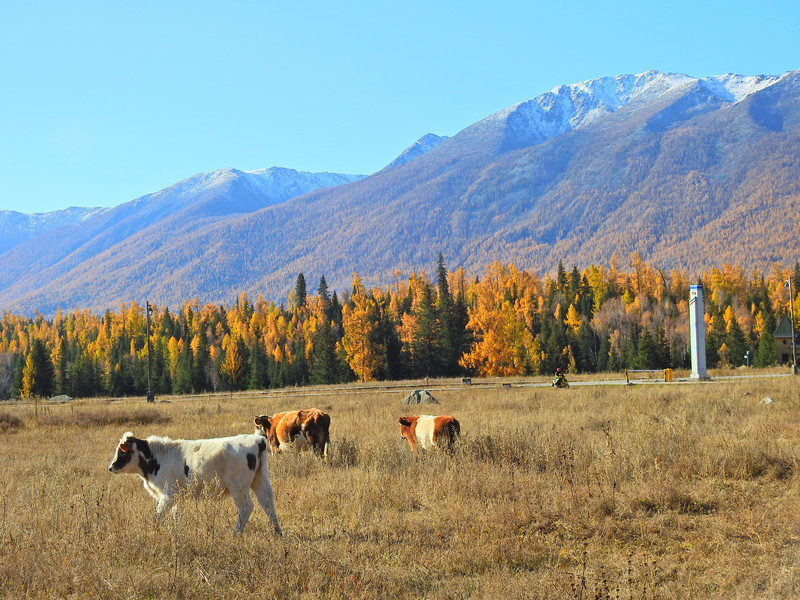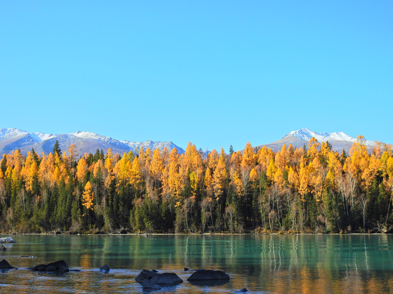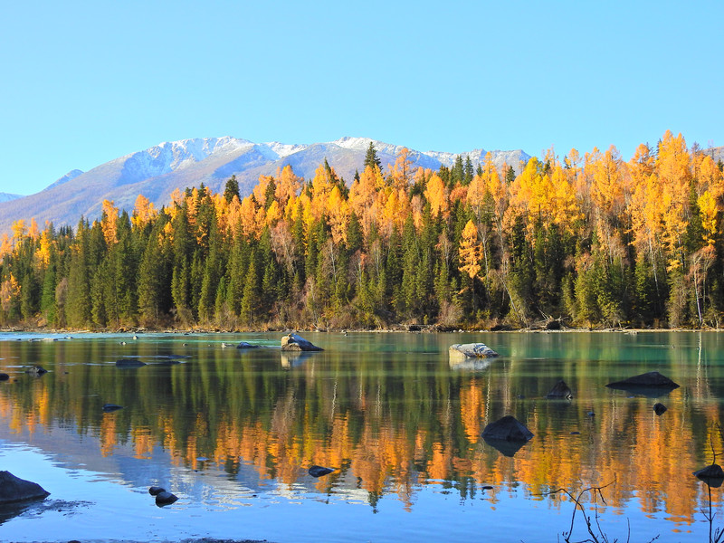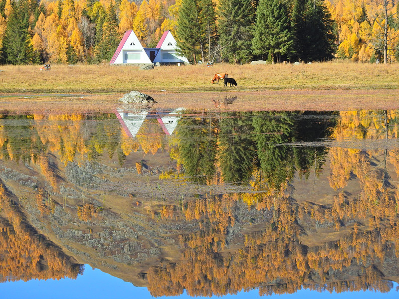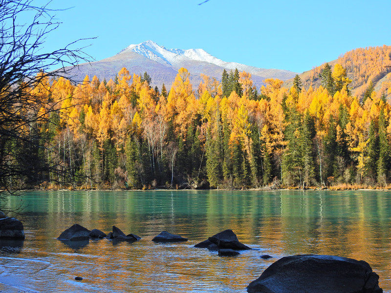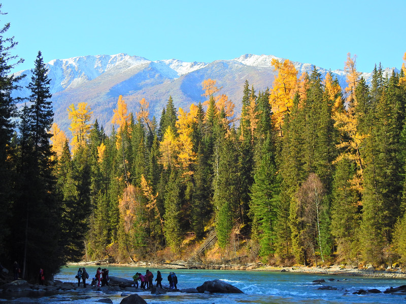 在喀纳斯湖入口处不远一处就有一处美景,远处的山峰、白雪、蓝天以及近处的黄色落叶松都映衬在一池湖水之中