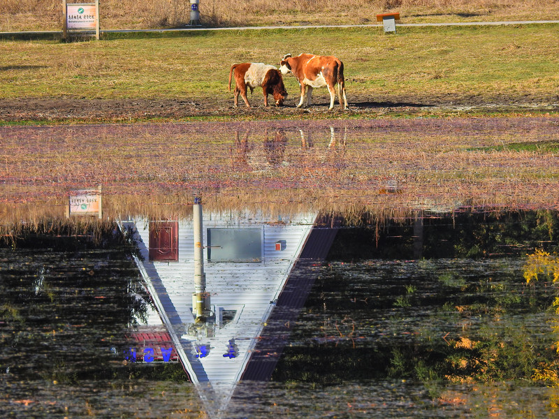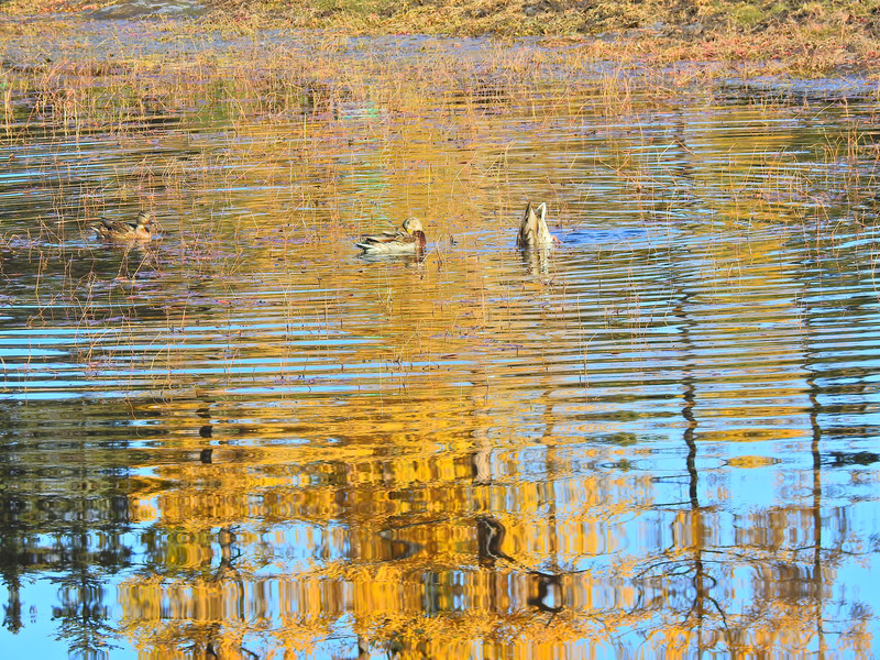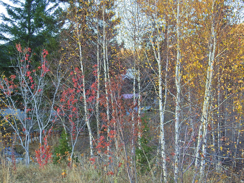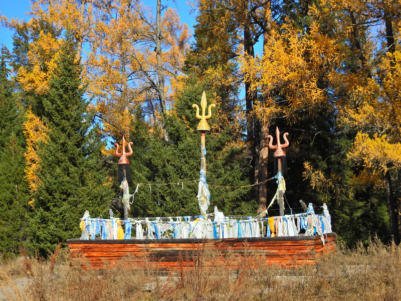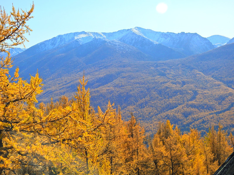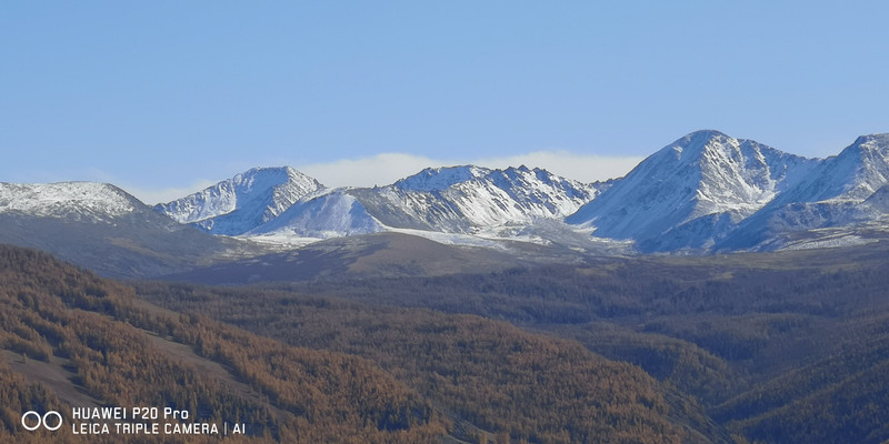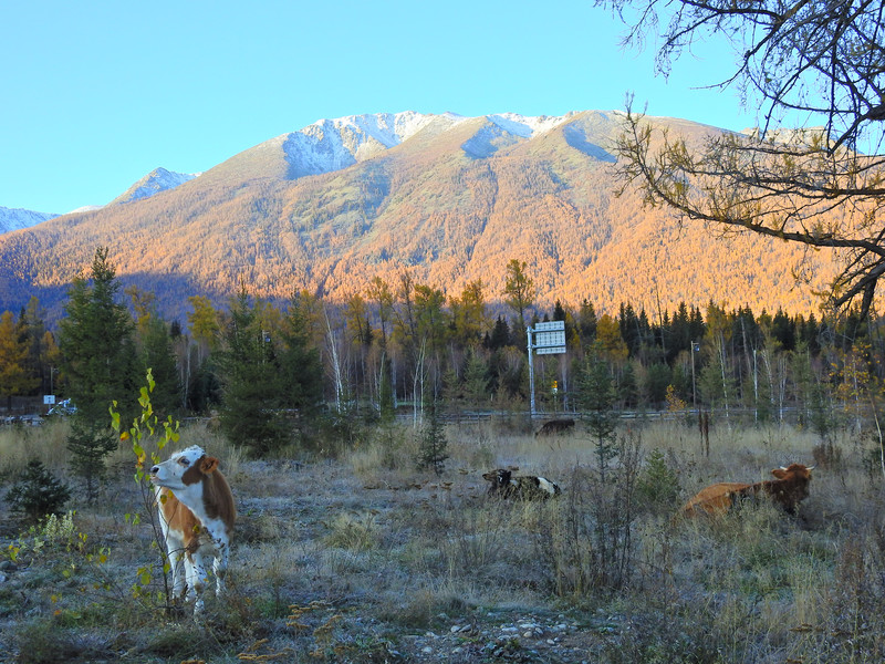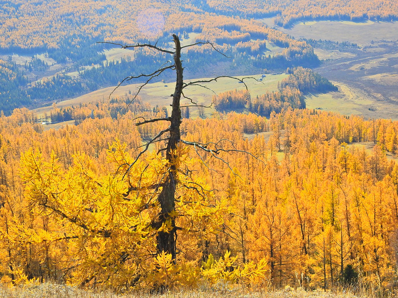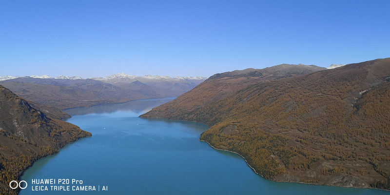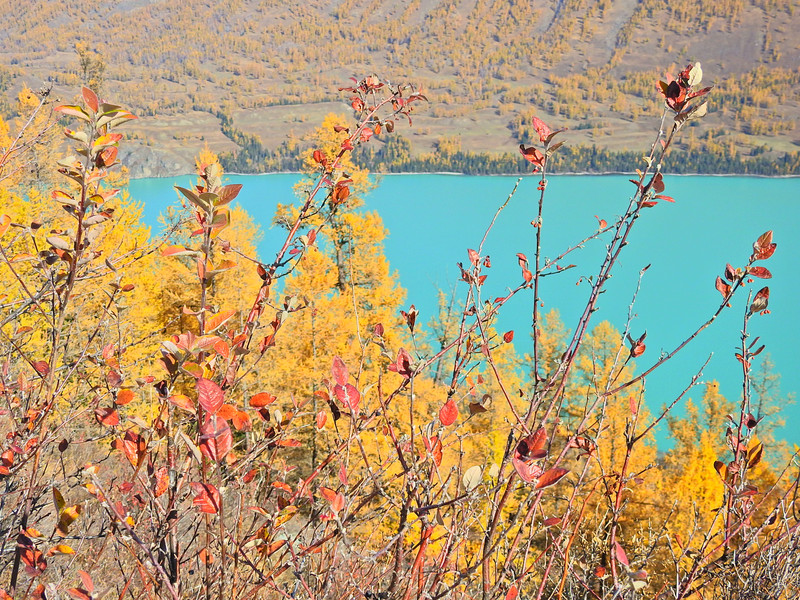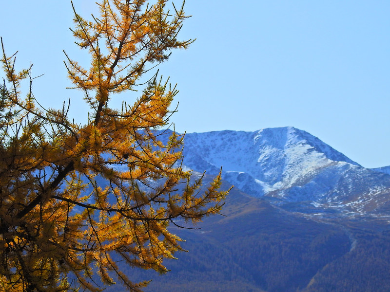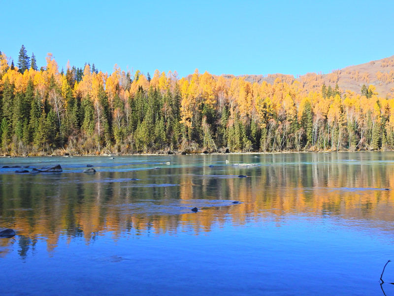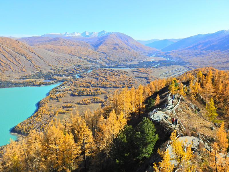 在喀纳斯湖入口处不远一处就有一处美景,远处的山峰、白雪、蓝天以及近处的黄色落叶松都映衬在一池湖水之中