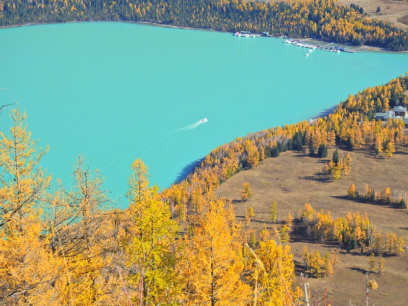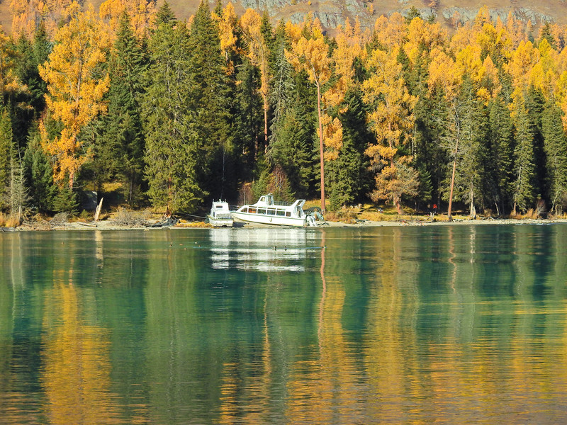 天一亮,我们马上吃了早餐就去了喀纳斯湖。喀纳斯湖水会随着季节和天气变化而变换颜色。从每年的四五月间开化到11月冰雪封湖,湖水在不同的季节呈现出不同的色彩。5月的湖水,冰雪消融,湖水幽暗,呈青灰色;到了6月,湖水随周山的植物泛绿,呈浅绿或碧蓝色;7月以后为洪水期,上游白湖的白色湖水大量补给,由碧绿色变成微带蓝绿的乳白色;到了8月湖水受降雨的影响,呈现出墨绿色;进入9、10月,湖水的补给明显减少,周围的植物色彩斑斓,一池翡翠色的湖水光彩夺目。