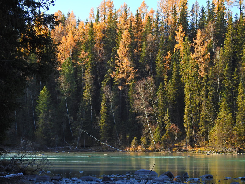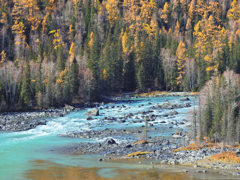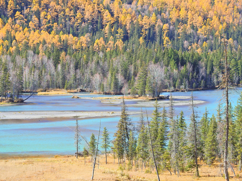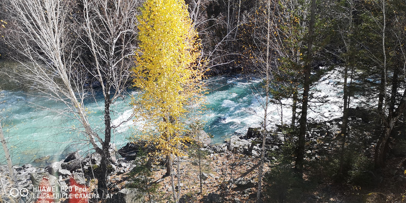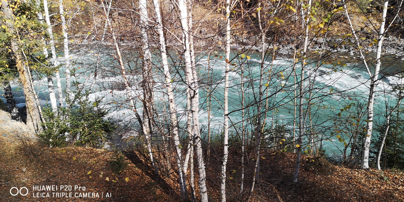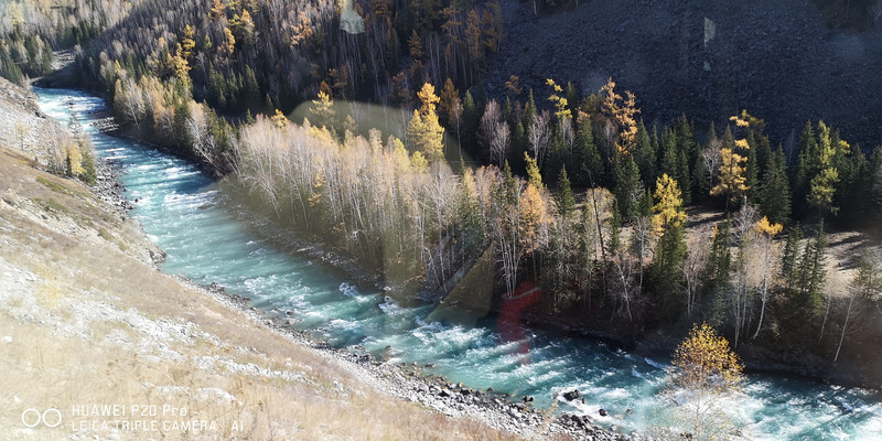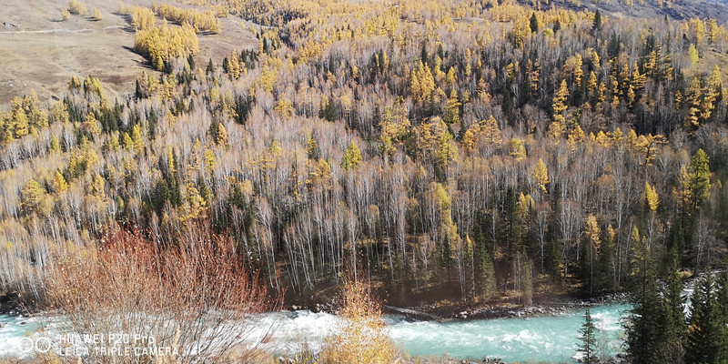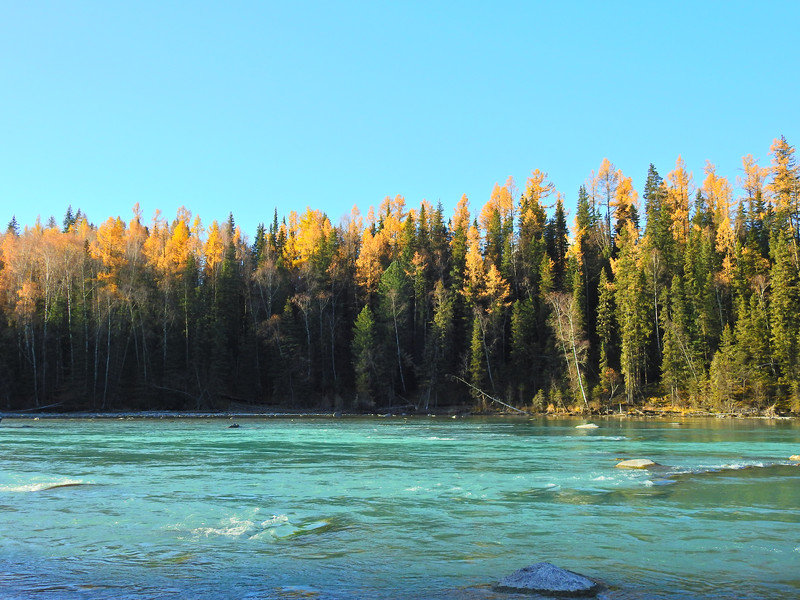 在喀纳斯河旁行走,可以看到河水不同的色彩