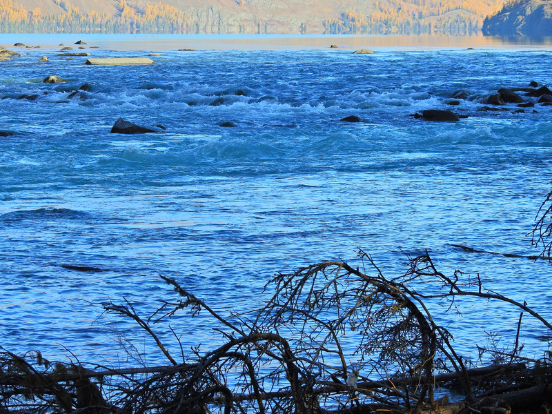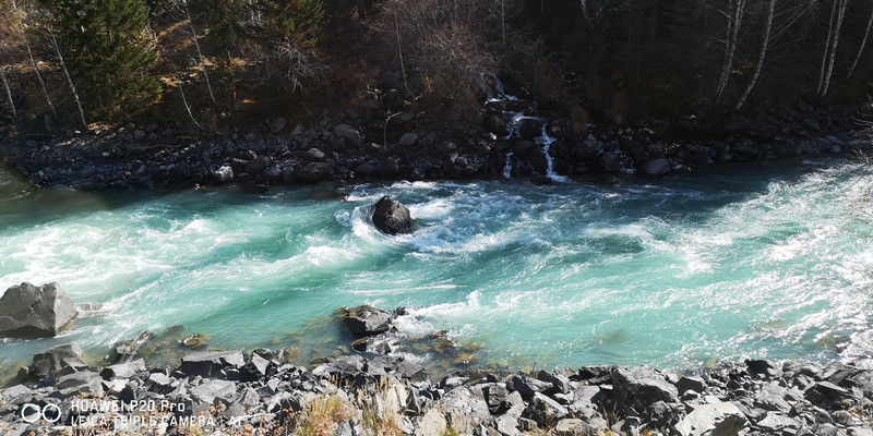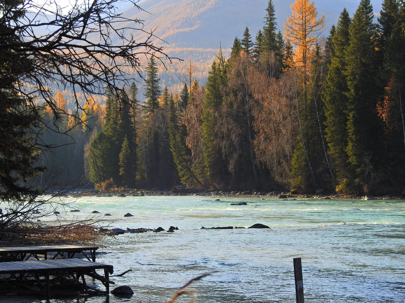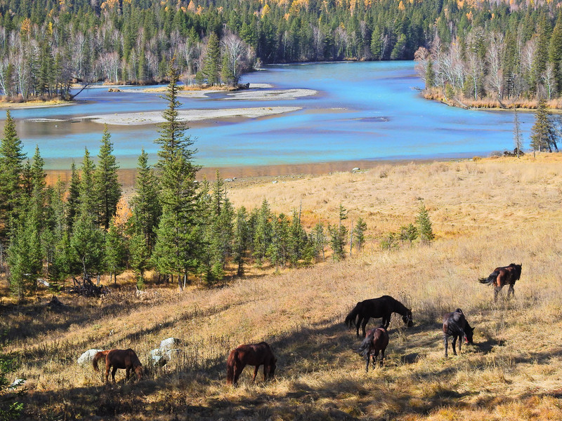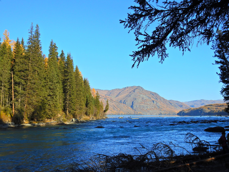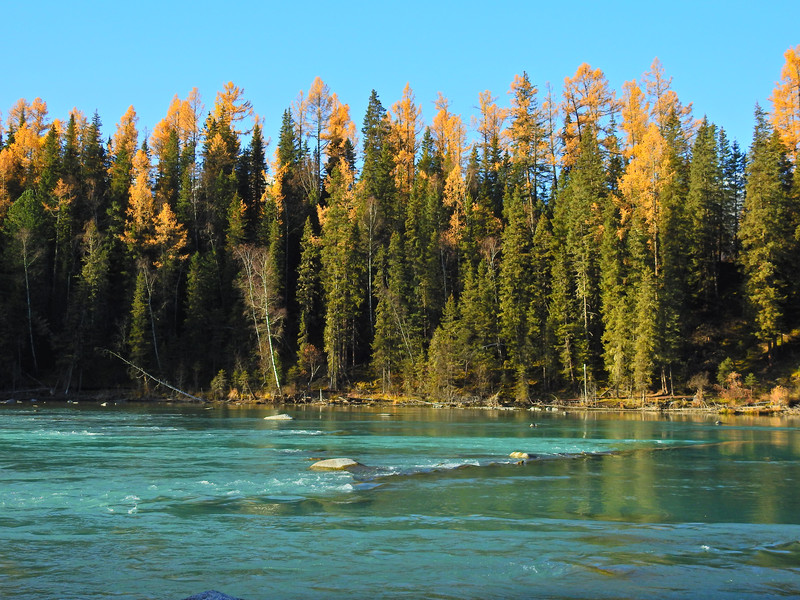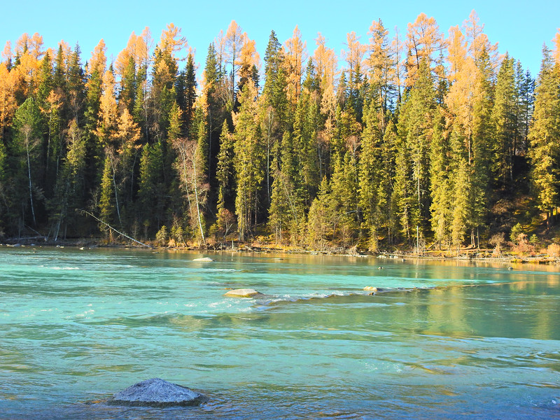 在喀纳斯河旁行走,可以看到河水不同的色彩