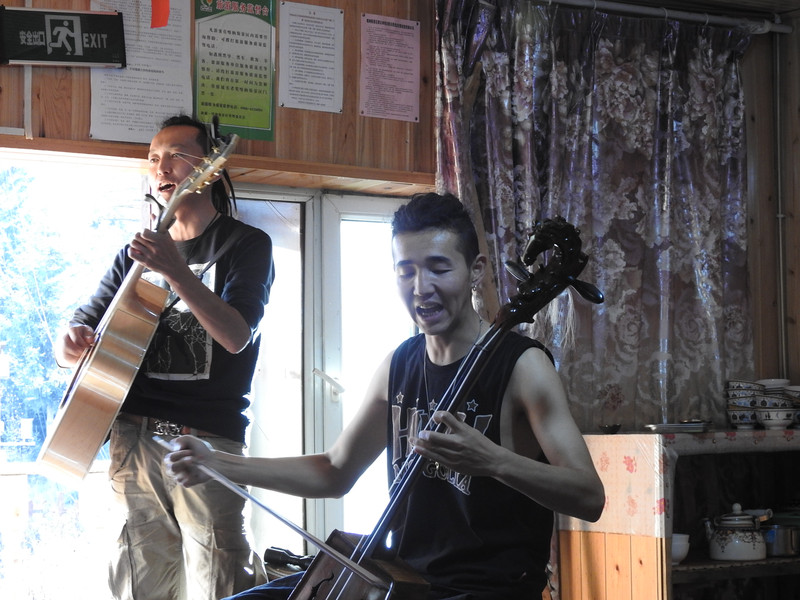 当地的居民是蒙古族的一个分支-图瓦族,他们分别介绍了桌面上摆放的食品和食用方法,而后又分别展示了他们民族风格的演唱。别小看这只小乐队和歌手,他们是和刘若英合作过的“旱獭乐队”。他们还展示图瓦族特有的、目前又十分流行的“呼麦”。这里由于上传的限制,无法上传整首演唱真是挺遗憾的。他们的演唱真的很打动人心