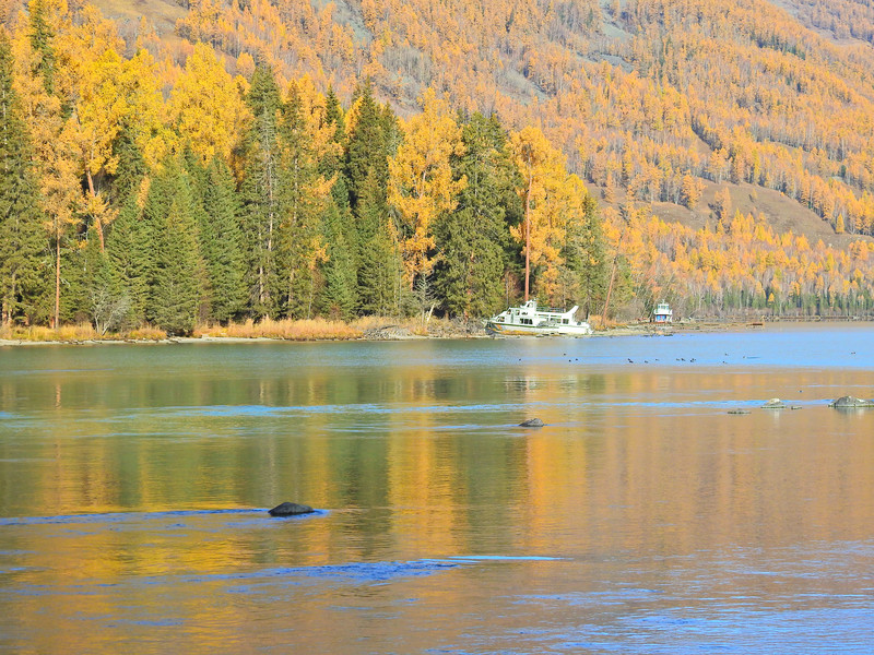 喀纳斯湖景色幽美,令人流年忘返,真是不虚此行。但为了在落日余晖之前赶到“五彩滩”,只能赶紧去乘摆渡车一路下山依次去,“神仙湾”、“月亮湾”和“卧龙湾”,然后出山门赶路
