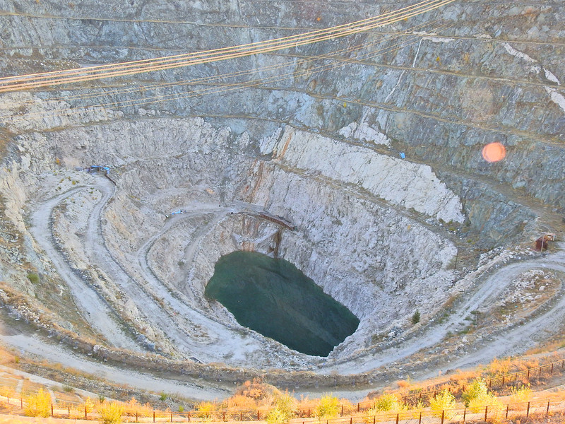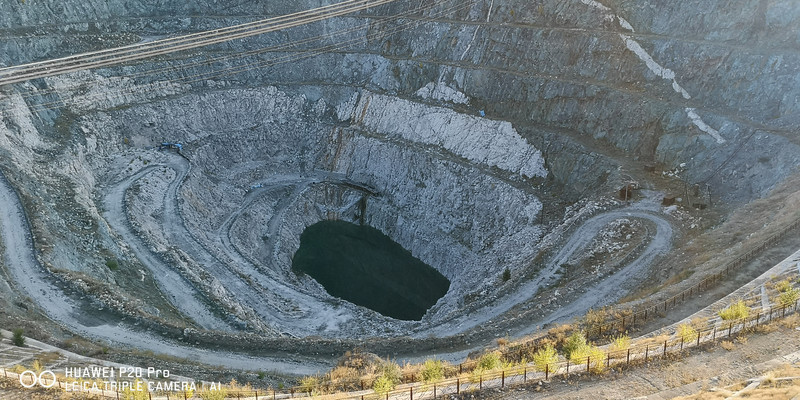 可可托海三号矿是伟晶岩脉矿坑,是世界上最大的露天矿坑之一,深200米,长250米,宽240米,边壁上的盘山道呈螺旋状,积水漫到矿坑腰部