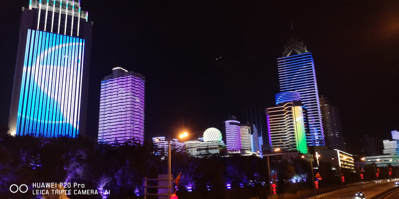 西大桥的灯光秀由成片的楼群组成,配上音乐和不同的灯光构成一幅动人的画面