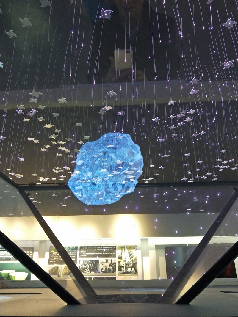 在地质陈列馆中,最引人注目的是一块指甲盖大小的透明玻璃状矿石。这是迄今世界上第一块额尔齐斯石。上图为3D的放大投影