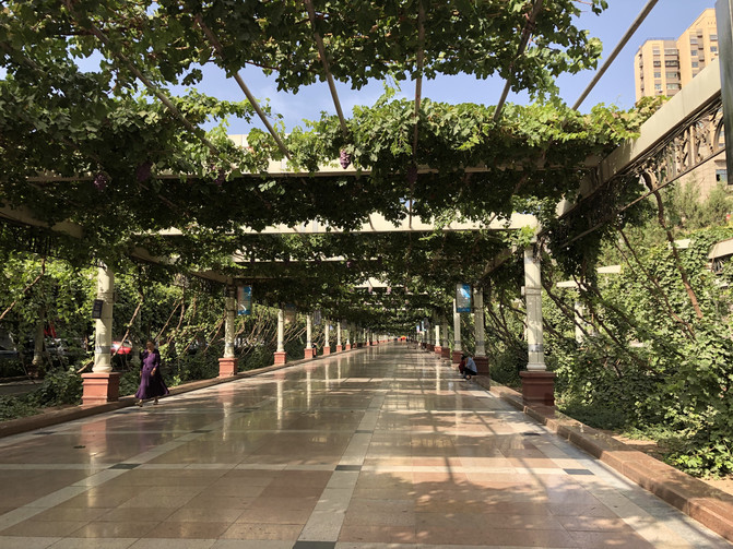 于是驱车吐鲁番市中心午饭并逛逛,市中心好几公里长的民族大团结长廊很赞,看到当地人随便摇一下葡萄藤,地上就落满了香甜的葡萄干,大人小孩直接捡了吃,很有些岁月静好的意思。