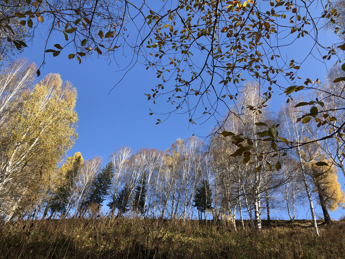 白桦林已经落叶不少,掉落叶子的枝丫却有一些虚幻的感觉,很好看!