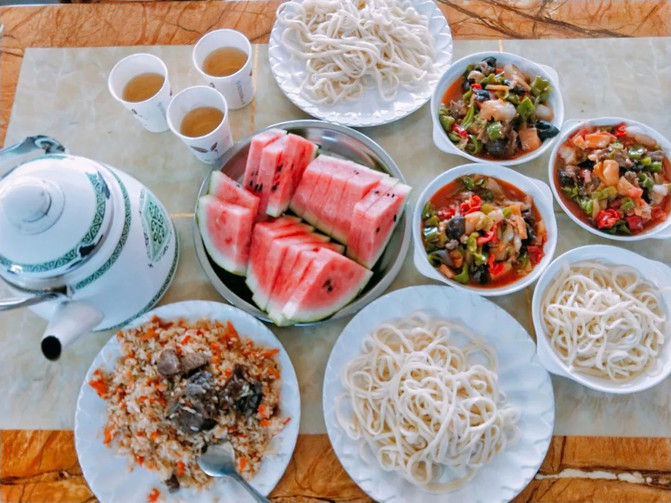 路途随意一个服务区吃今日份的正餐,手抓饭、拌面、超甜瓜果、再配上清凉的茶饮,可以说是很当地了,跟着我们一起游新疆