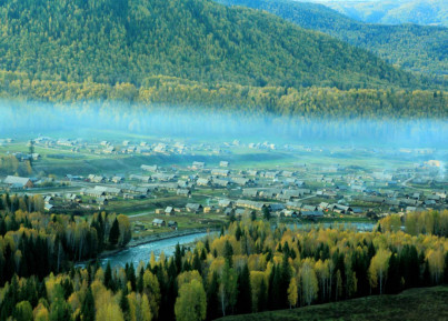 今天我们可以早起观看【禾木景区】的日出,清晨,太阳还没有升起,浓重的雾蔼笼罩着整个村庄,树木、房屋、围栏,都在雾色中若隐若现,白色的雾气像飘带一样缠绕在远处的山腰。此时,人们就已经开始忙碌了。村里的小路上,牧民骑着马赶着牛羊向村外走去。一条小河从村边流淌而过,在树林中转了一个弯,继续向西奔流,汇入布尔津河。白云朵朵,飘浮在山谷的上空,阳光倏而从云层的裂隙中透出一屡金光,播撒在禾木村上,面对如此美景,感叹当年图瓦人的祖先,为躲避战乱,找到如此一片与世隔绝的净土,定居繁衍了下来,如果陶渊明先生有幸到此,恐怕又要有一篇《桃花源记》了。