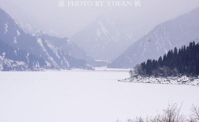 现在正值冬季,天山天池已经冰封,我们前一天去的时候还下着大雪,天池上白茫茫的一片(如首图),能见度也不高,巍峨的天山东部最高峰博格达峰也看不见,于是我们只能怏怏而归,原以来我们的天池之旅只能就此结束(因为我们第二天一早就要离开天山,去另外一个景点),但是令人意外的是,我们第二天居然再次来到了天池。