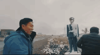 乌鲁木齐101省道丹霞地貌看到道路一侧的社会主义交警塑像被西方的资本主义大雪蒙蔽了双眼,我们立即靠边停车,屁颠屁颠的过去扫了扫雪,拜了一拜。