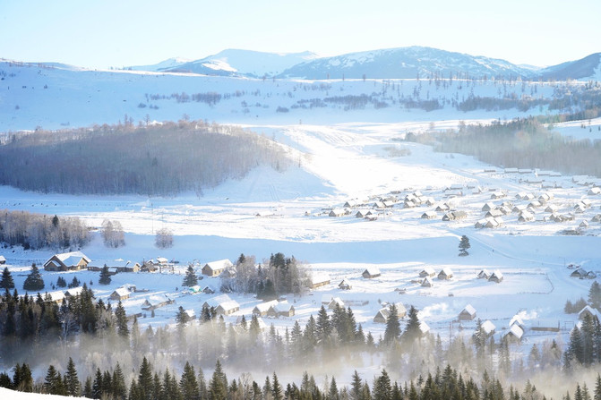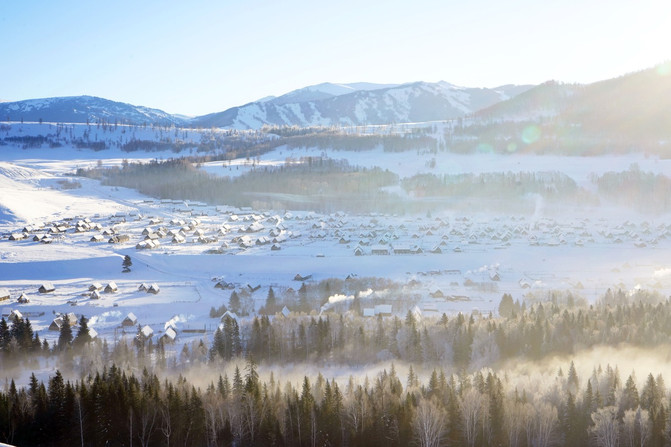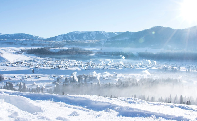 日出就在一瞬间,几分钟后雪和光笼罩的 禾木 太美,村庄炊烟袅袅就像爱丽丝梦境一般,美得不像话!在赞叹大自然的惊奇之美,也不忘让木鱼在这美景下留下影像记忆!