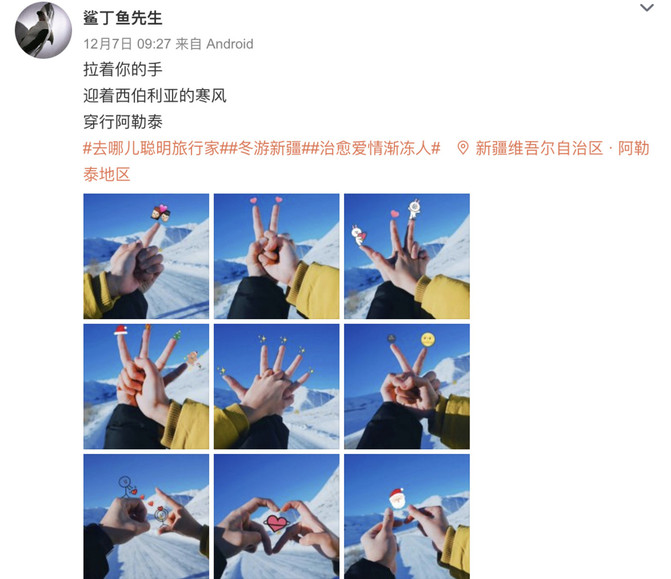 拍组爱心姿势,寒冷的天,就是有爱的人手牵手才温暖啊!到 喀纳斯 的时候时间有点晚,虽未能看到喀纳斯 ,但让大巴车给我和木鱼打了光,在月亮湾前拍照留念,期待下次我俩重回。