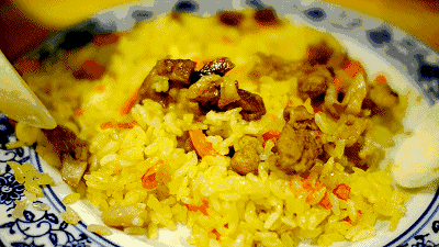 金黄的抓饭还泛着晃亮亮光泽呢~but吃到嘴里丝毫不油腻,每碗抓饭再配上泡菜、胡萝卜小菜,每根萝卜丝都浸透了醋汁味道酸爽到爆!加饭加水,服务很热情噢!