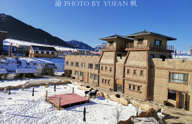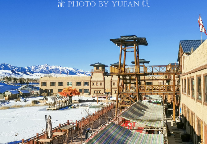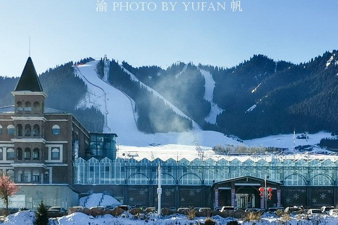 站在丝路影城的楼顶,一面是巍峨的博格达雪山,一面是中国西北地区最大的滑雪场——蓝山丝绸之路滑雪场,风光无敌,环境绝佳,无论是滑雪、赏雪、玩雪、拍照,都非常不错。