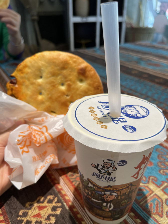 黑面饼还没吃完,我又看到了烤包子,忍不住买了两个。烤包子真真比那黑面饼好吃多了,果然网上推荐的没错。此时,我们已经饱了。但云姐对辣皮子馕念念不忘,我们又回到了大巴扎馕店。上到二楼,买了两个辣皮子馕,又在阿凡提奶茶店要了两杯咸奶茶,开始一边喝奶茶,一边啃馕。顺带提下这个咸奶茶,是没有珍珠的那种哦。里面加的是碎花生米,味道也是咸的,十分不错。