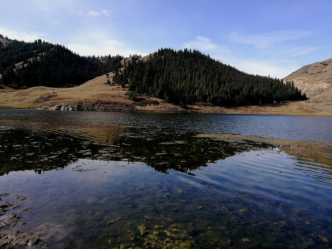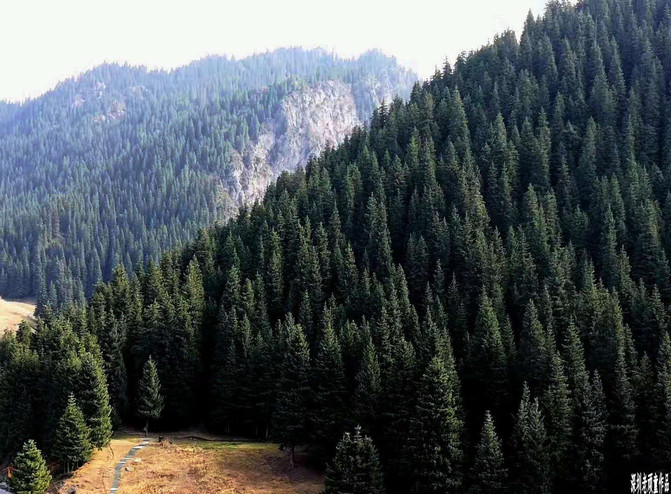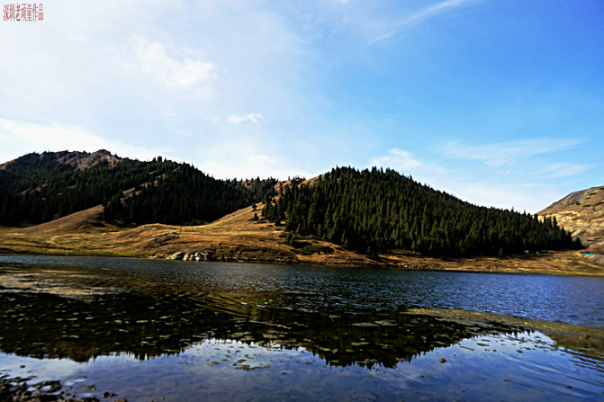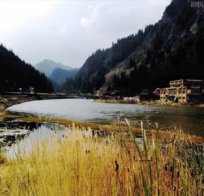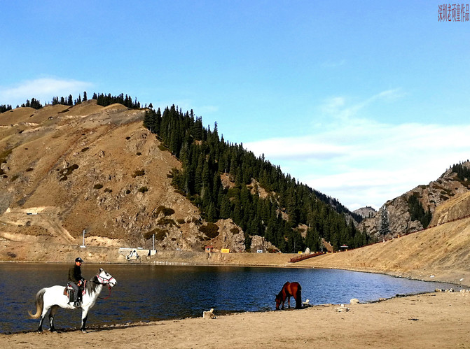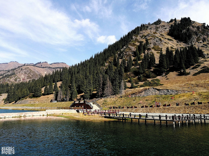 从天鹅湖折返下到景区中心交通枢纽《碧龙湾》,这里有一座水库当水蓄满时,库水平面形似一条碧龙,故称碧龙湾。站在天山坝坝顶是观赏碧龙湾和照壁山最佳之地,起伏的山坡,高大的雪岭云杉,不断冲击着我的视觉。在交通枢纽车站的旁边,坐落着一些楼台亭阁,里面有餐厅,茶座,酒店等服务设施,供人们用餐,休闲,娱乐之用。